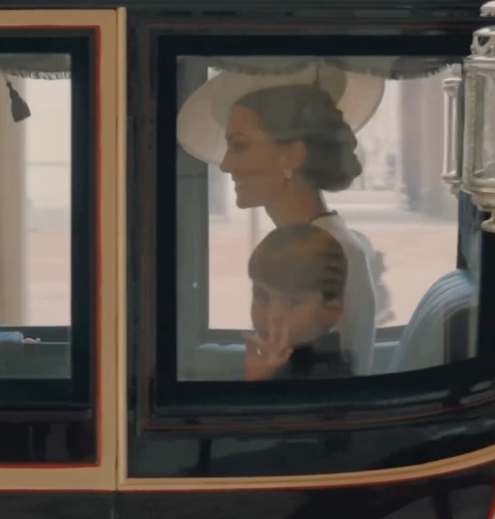 Kate dopo essere arrivata a Buckingham Palace in auto con la sua famiglia, ha preso parte alla processione viaggiando su una carrozza trainata da cavalli attraverso la pioggia battente nel centro di Londra con i suoi tre figli: il Principe George, 10 anni, la Principessa Charlotte, 9, e il Principe Louis, 6.