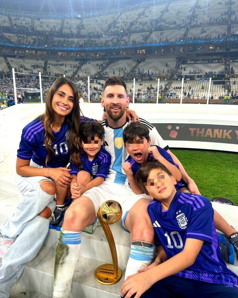 Leo Messi prova una gioia incontenibile: è sul tetto del mondo con la sua Argentina. Il campione 35enne, vincitore per ben sette volte del Pallone d’Oro (l’ultimo nel 2021), dopo aver celebrato la vittoria con la Francia in finalissima con la sua squadra, festeggia la vittoria del Mondiale in Qatar anche con la moglie e i tre figli. In campo posa con la gloriosa coppa tra le mani insiene ad Antonella Roccuzzo e ai loro amatissimi Thiago, Mateo e Ciro, dati alla luce dalla 34enne rispettivamente nel 2012, 2015 e 2018.