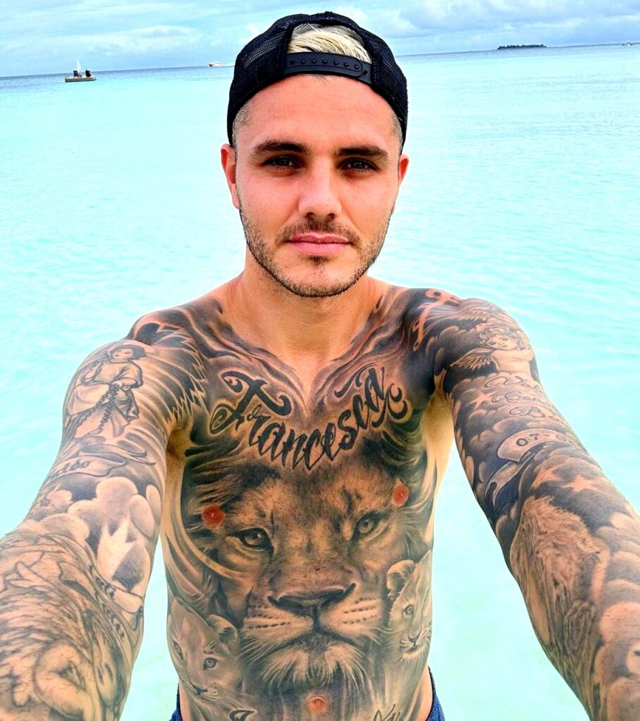 Maurito, 29 anni, ha fatto il suo primo tattoo a 14 anni, facendosi imprimere sull’epidermide del bicipite destro il suo stesso nome. Nel 2017 ha deciso di iniziare a riempire tutto il busto: ci ha messo cinque mesi. Ha voluto che gli fosse disegnato il muso di un leone, che copre petto e addome, insieme a due piccoli leoncini, uno a destra e uno a sinistra, che simboleggiano le due figlie, Francesca, 7 anni, e Isabella, 6, avute dall'ex Wanda Nara, di cui ha tatuati i nomi sul petto e sul ventre.