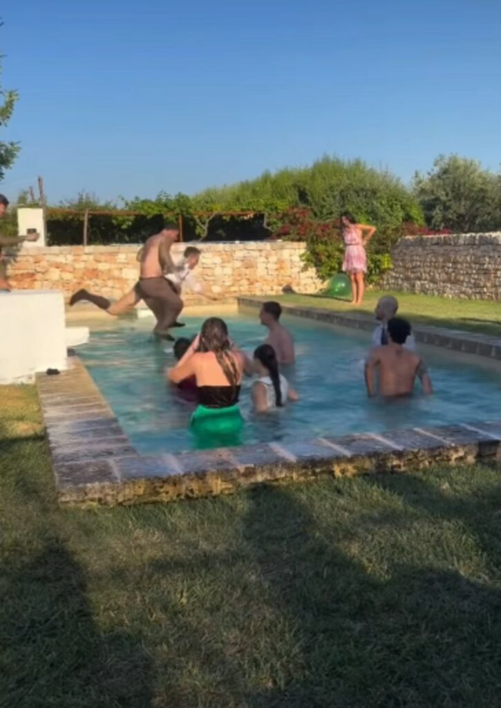 Prima la toccante cerimonia in chiesa, poi il pasto, infine, dopo la digestione, anche un bel tuffo in piscina, dato che il grande caldo si fa sentire.