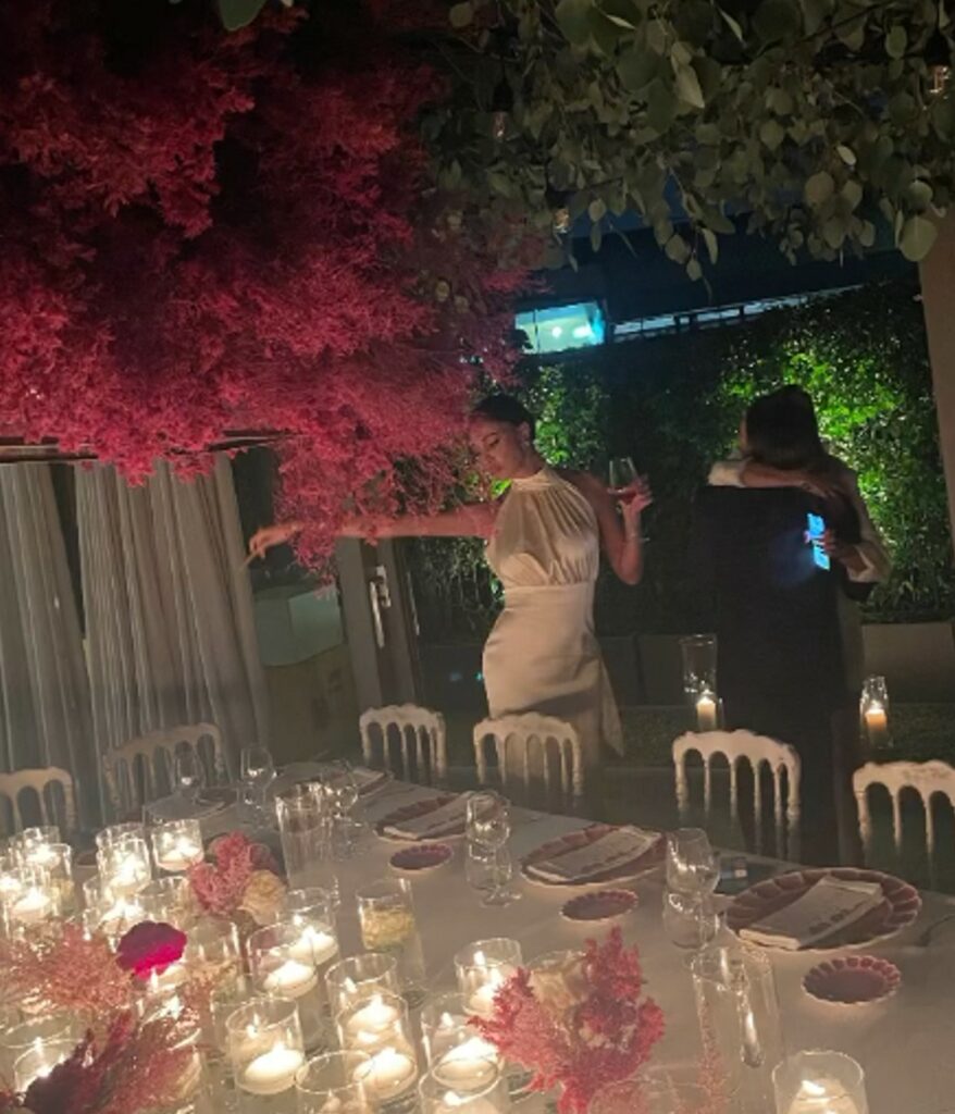 La cena, organizzata in un ristorante a Milano, aveva un allestimento super romantico: un grande tavolo bianco al centro della sala con una decorazione floreale sui toni del lilla e del prugna, tempestato di mille candele.