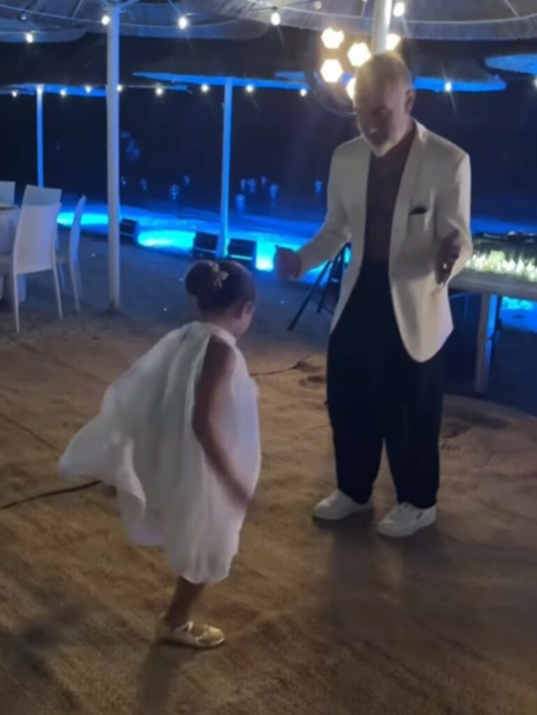 Insieme a Gianluca e Sharon, la piccola Blu Jerusalema, la bambina nata dalla relazione il 27 ottobre 2020. Pure la bimba indossa un abito bianco e sorride e si scatena col papà.