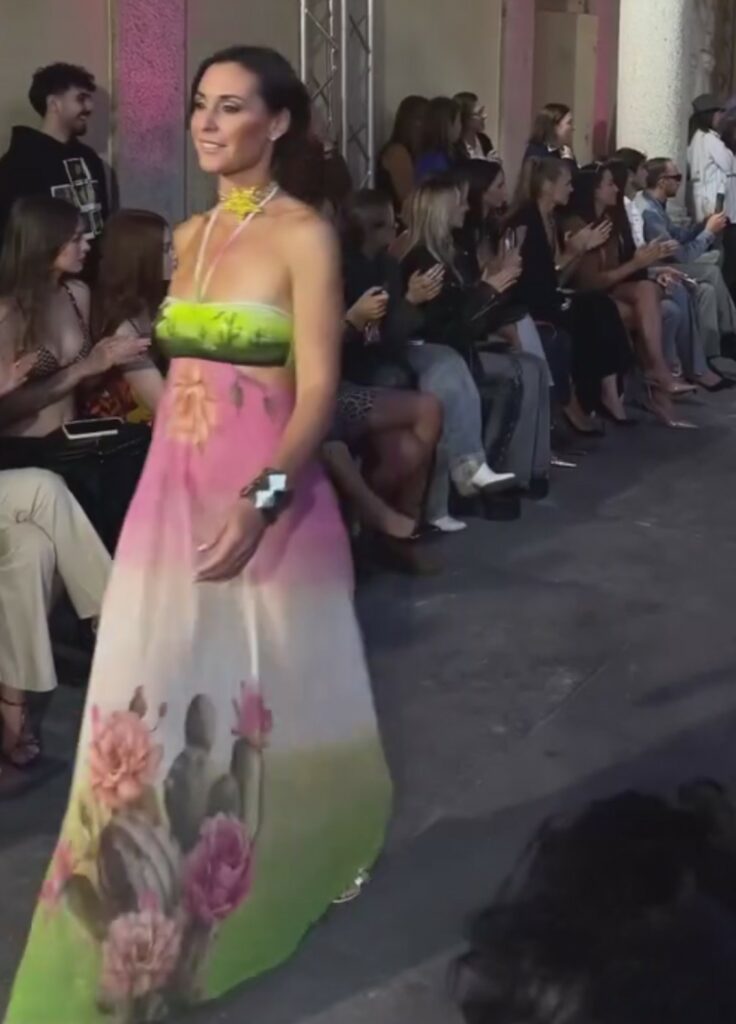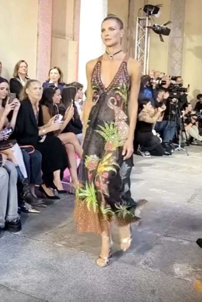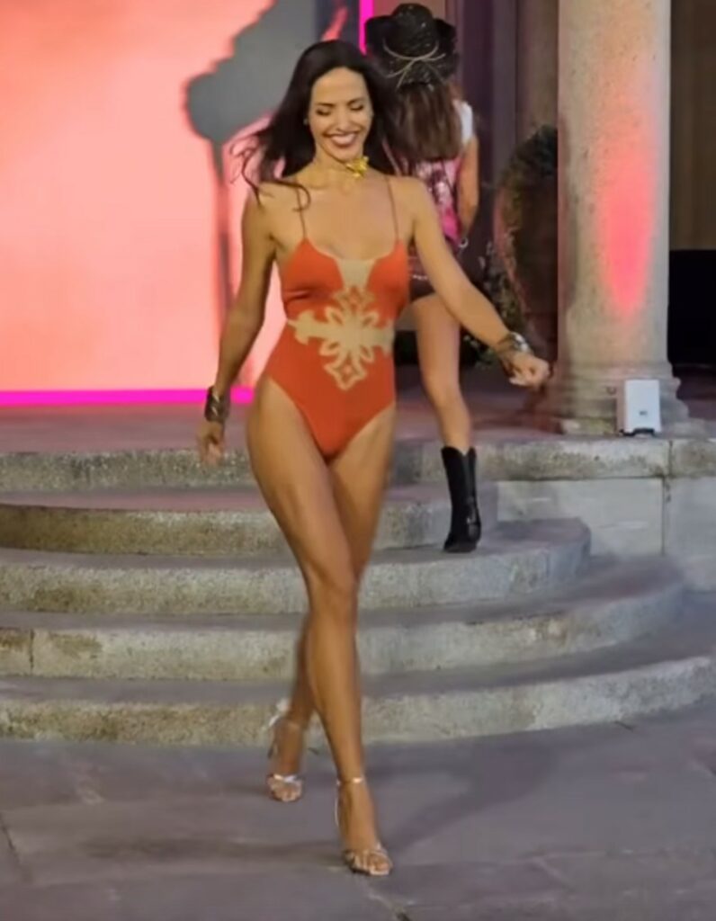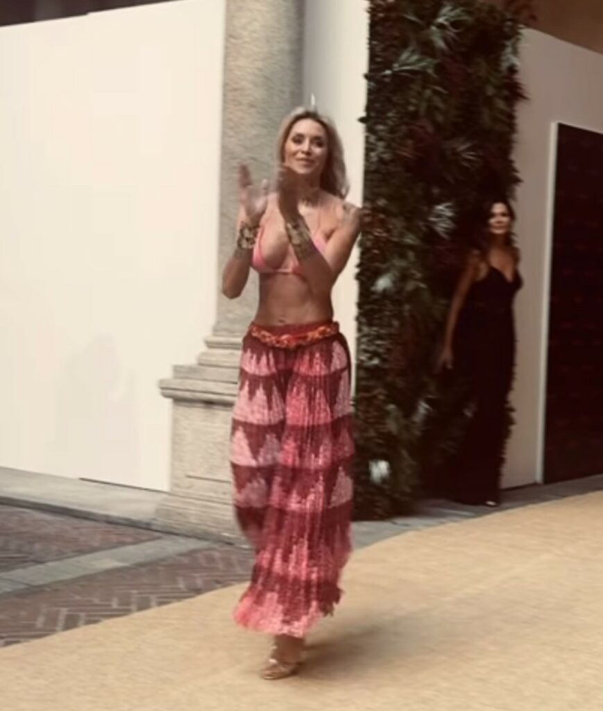 Alla Milano Fashion week si festeggiano i 30 anni di Pin-Up Stars, brand di beachwear che ha presentato la collezione Estate 2025. Per l'occasione, quindi, la conduttrice ha sfilato indossando un bikini rosa e uno color cuoio.