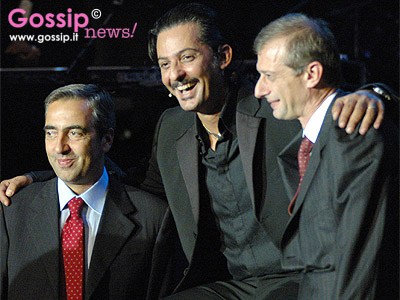 Fiorello fra l'on. Maurizio Gasparri, esponente del governo, e l'on. Piero Fassino, rappresentante dell'opposizione