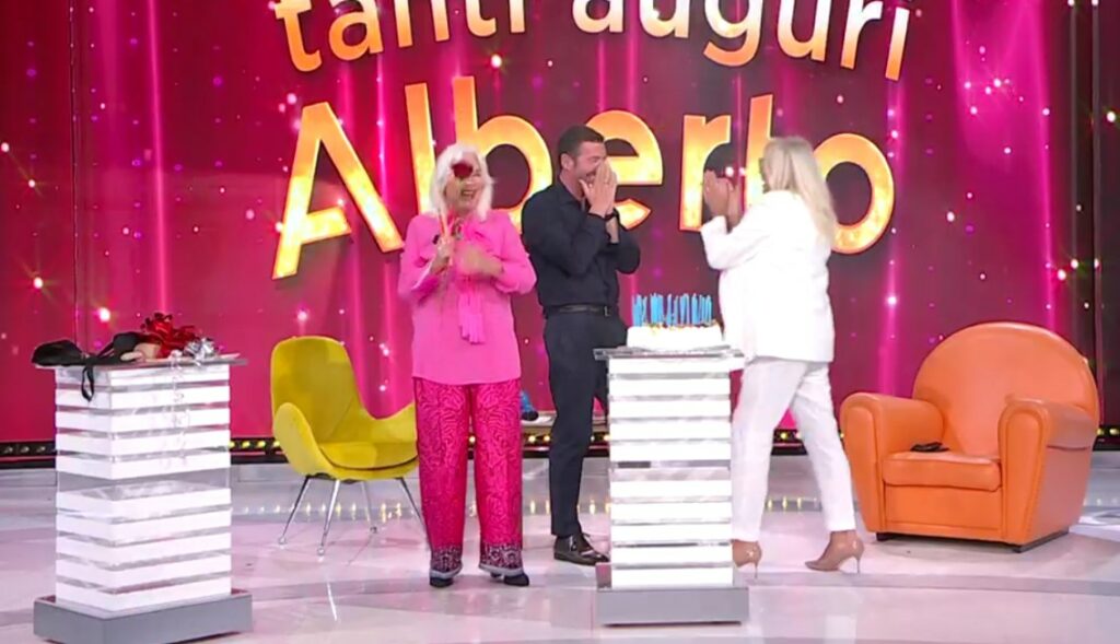 Subito dopo arriva la sorpresa della Venier: la torta di compleanno per i 50 anni di Alberto Matano, che gioisce. “Troppe sorprese Mara!”, esclama lui. La presentatrice gli regala un grembiule con un set per il barbecue infilato nelle capienti tasche.