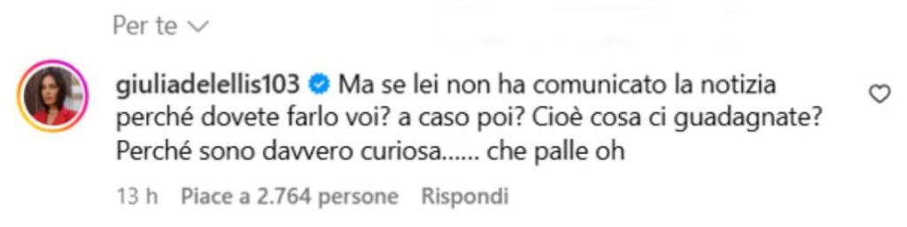 La De Lellis scrive: “Ma se lei non ha comunicato la notizia, perché dovete farlo voi? A caso poi? Cioè cosa ci guadagnate? Perché sono davvero curiosa… che palle, oh!”.