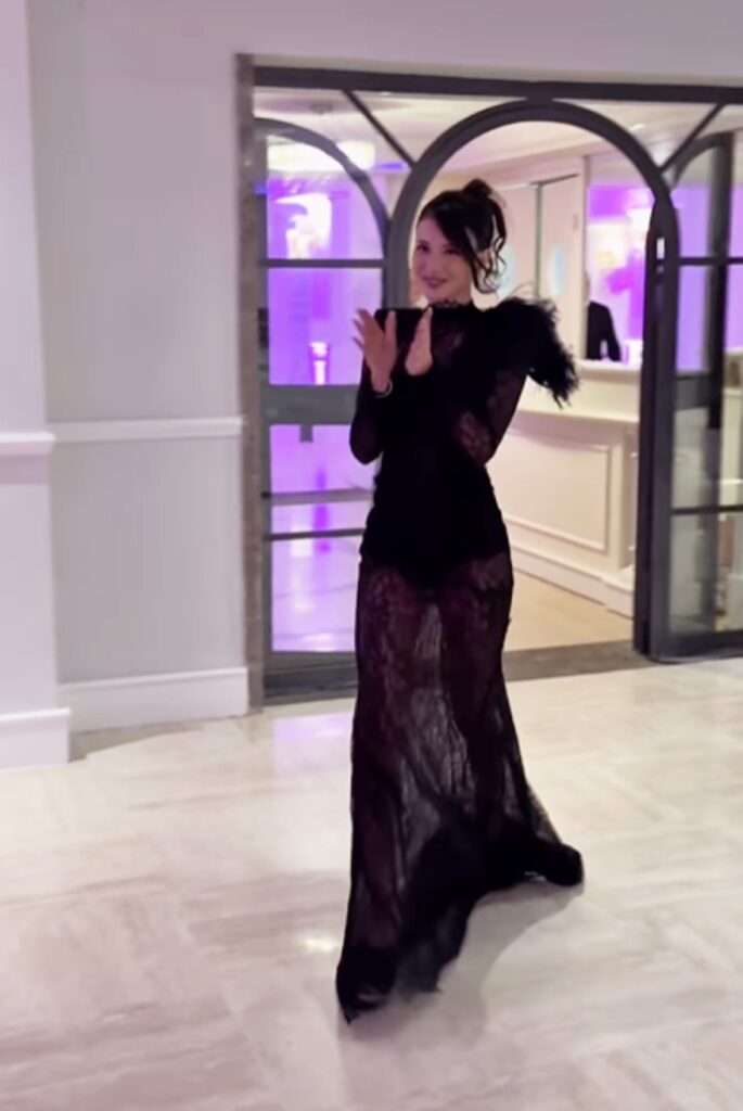 A brillare è Mya con l’abito ‘Dark Couture’ black in pizzo, costo 1900 euro, che scolpisce la sua silhouette e le lascia la schiena completamente scoperta. Il capo ha delle piume applicate sulla spalla che lo rendono ancora più particolare.
