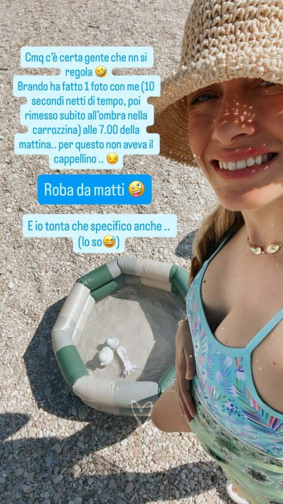"Primo giorno di mare per me e Brando”, scrive sul social facendosi vedere in alcuni scatti insieme al piccolo. Non dice se è nella vicina Senigallia o altrove. Alice indossa un costume intero e un pareo, protegge la testa con un delizioso cappellino. Pure Brando è vestito con magliettina e pantaloncini. E’ andata al mattino presto, alle 7: il caldo di questi giorni, altrimenti, sarebbe stato insopportabile per il bebè.