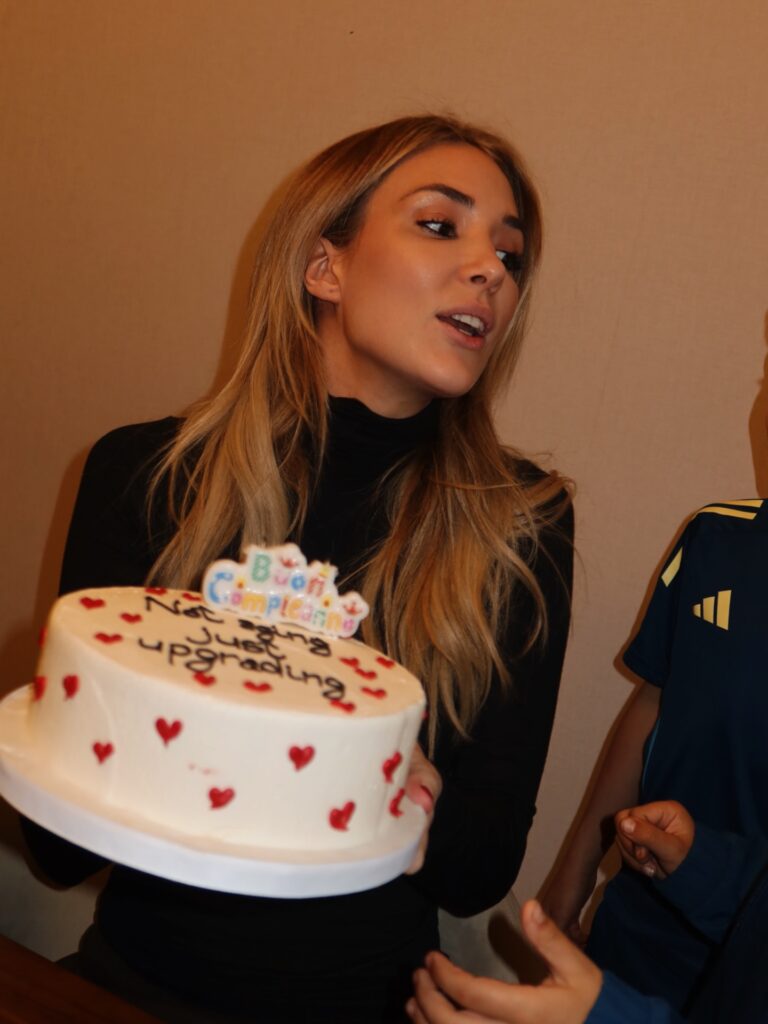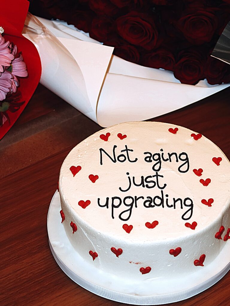 Sul dolce spicca una scritta ironica in inglese: “Not aging just upgrading”. Cioè: “Non sto invecchiando, sto solo facendo un upgrade”. Un messaggio giocoso per celebrare l’ingresso nei 31 anni.