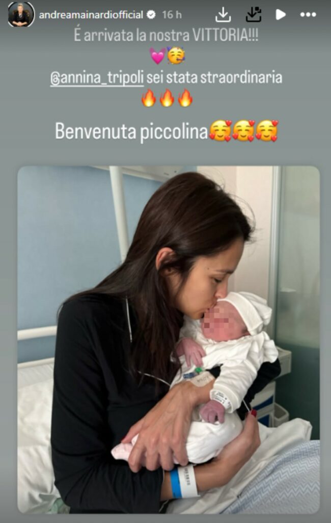 Nelle sue Storie lo chef condivide un’immagine di Anna Tripoli, imprenditrice bresciana che ha sposato nel 2019, dopo quattro anni di fidanzamento, insieme alla figlia. La donna bacia teneramente la piccola. “E’ arrivata la nostra Vittoria. Anna sei stata straordinaria! Benvenuta piccolina”, scrive.