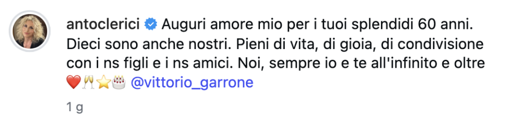Condivide un reel su Instagram in cui raccoglie tanti scatti che raccontano l’intensa storia d’amore che vivono dal 2016. Nelle Storie, poi, pubblica una foto con lui: tra le mani ha una bella torta di compleanno piena di riccioli di cioccolato. Antonella Clerici festeggia i 60 anni, compiuti ieri, 27 aprile, del compagno Vittorio Garrone. La conduttrice gli fa una dolce dedica e scrive: “Dieci sono anche nostri”. Parla proprio degli anni vissuti l’una accanto all’altro.