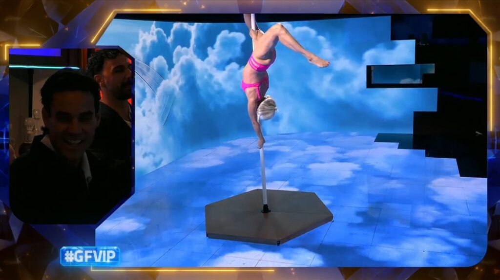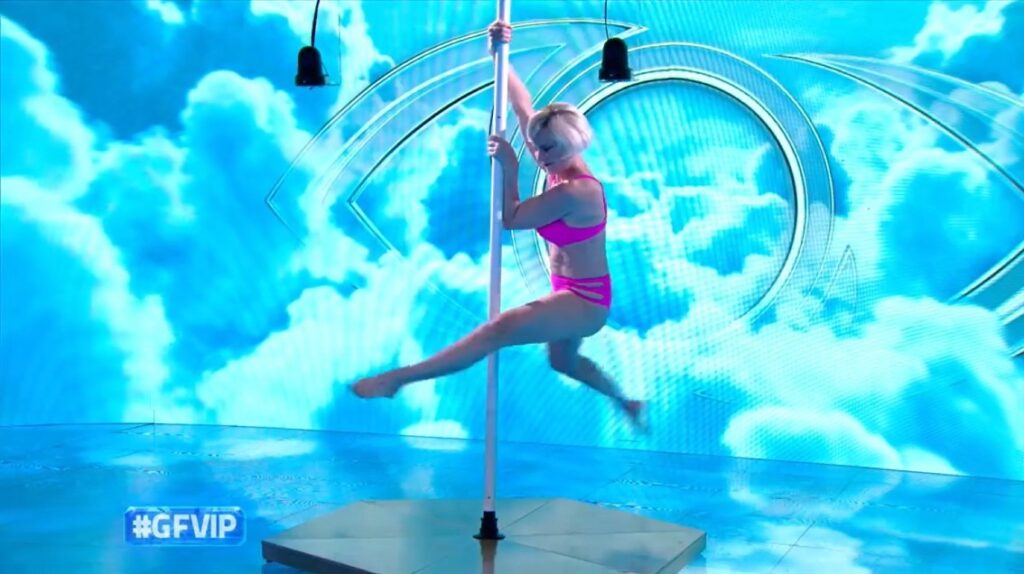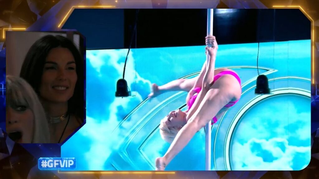 La showgirl mette a segno una performance di tutto rispetto accompagnata dal brano di Sia, “Chandelier”. Ha forza, coordinazione, flessibilità e controllo del corpo durante le sue acrobazie anche a testa in giù e in spaccata. Sul palo non ha paura, anzi.