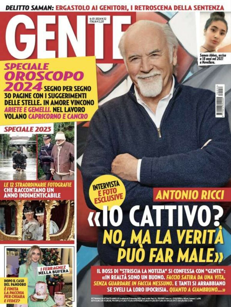 Antonio Ricci si concede eccezionalmente alle domande di Umberto Brindani, direttore di Gente, che gli regala la cover del settimanale. In una lunga intervista parla dei 35 anni di Striscia la Notizia, confessa di divertirsi ancora tanto: “Tu non ti divertiresti quando fai un casino e ne parlano fino alle Isole Figi?”. Torna pure a parlare dei fuorionda di Giambruno e si dice stupito dalla Meloni. “Certi soggetti sono intoccabili?”, si domanda con un pizzico di ironia.