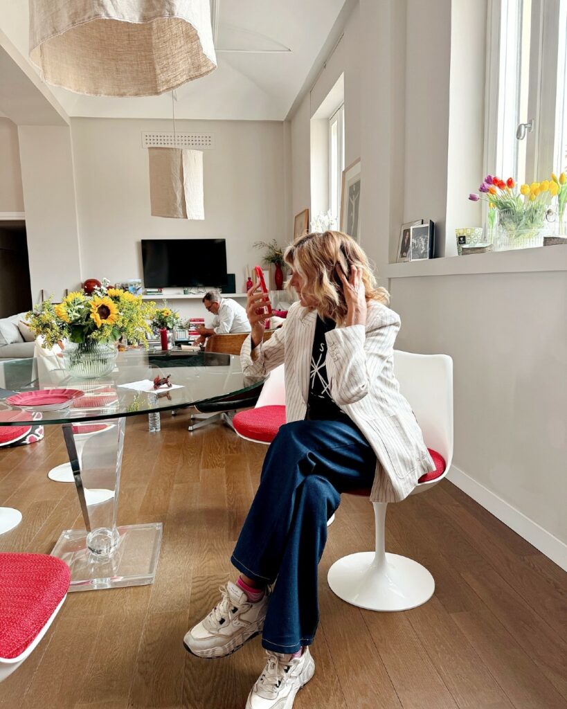 Poi c’è il soggiorno con le pareti bianche, il tavolo rotondo in vetro con sedie moderne sempre white e il divano color crema. I lampadari sono ecrù, ci sono vasi di fiori, opere d’arte e foto che riempiono la stanza di vibrazioni positive