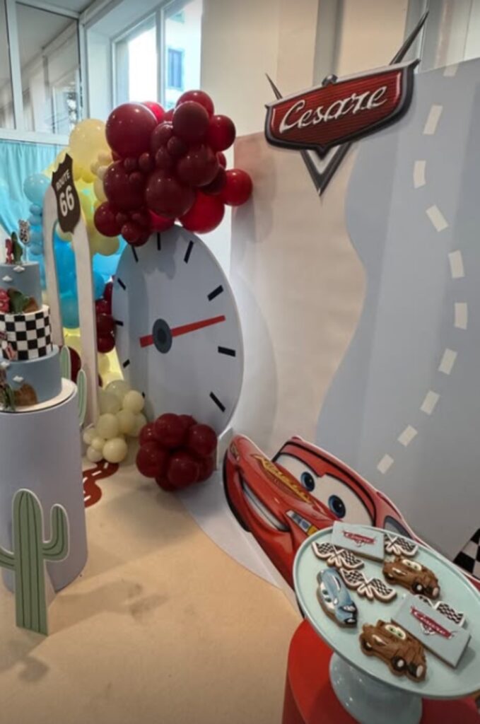 Tutto è colorato. Il party è dominato dal colore rosso, quello di Saetta McQueen, ma ci sono pure il nero e bianco della bandiera a scacchi delle corse. Le decorazioni sono perfette, ispirate ala Piston Cup. Bandierine e palloncini completano il tutto, come pure il dolcetti dedicati del festeggiato.
