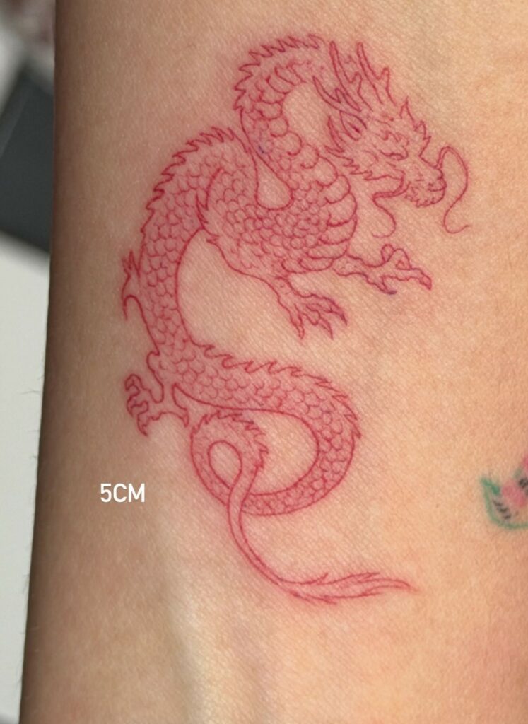 Aury non spiega cosa voglia dire il suo nuovo tatuaggio, ma, solitamente il drago rosso simboleggia passione, coraggio, energia e forza, rappresentando spesso protezione attiva e potere, soprattutto nella tradizione tatuaggi giapponese dove il colore rosso rafforza questi significati legati al fuoco, alla vitalità e al principio maschile Yang, a differenza del drago occidentale più malvagio. E’ un segno di determinazione e vitalità, che esprime potere ed energia.