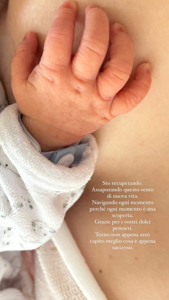 Nelle sue IG Stories annuncia un piccolo stop dai social e, pubblicando una foto in cui si vede la manina di Cesare, scrive: “Sto recuperando. Assaporando questo vento di nuova vita. Navigando ogni momento perché ogni momento è una scoperta. Grazie per i vostri dolci pensieri. Torno non appena avrò capito meglio cosa è successo”.