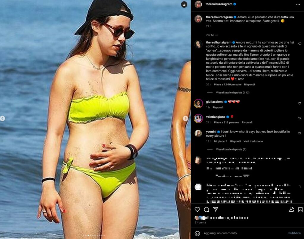 Aury è tornata tante volte sul suo fisico, spesso giudicato dagli altri non all’altezza, paragonato a quello perfetto della famosa madre, Michelle Hunziker. In passato tutto questo le ha fatto molto male. Adesso invece scrive: “Amarsi è un percorso che dura tutta una vita. Stiamo tutti imparando a respirare. Siate gentili”.