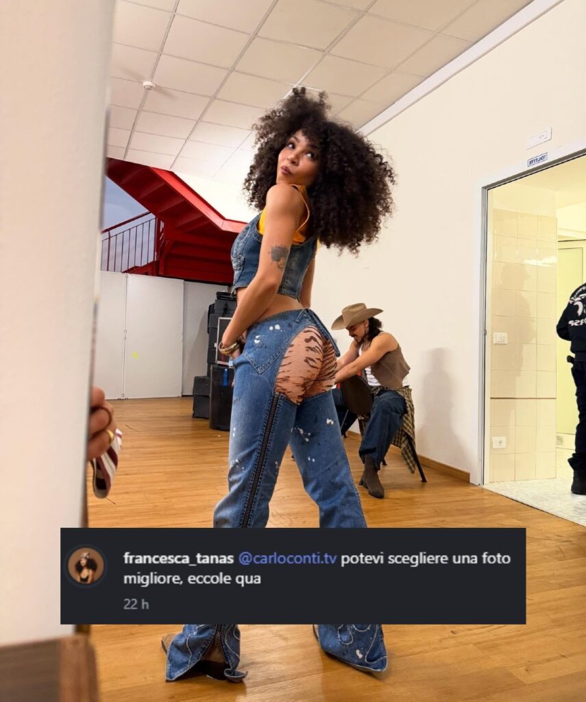 La polemica continua… La ballerina Francesca Tanas si scaglia contro Carlo Conti per la frase sui suoi jeans 'hot' a Sanremo 2026. Il conduttore, ironico, rivolgendosi alla moglie dopo l’esibizione di Samurai Jay, quella in cui lei ballava col capo ‘incriminato’ addosso, le aveva detto di non comprarli. “Mi ha sessualizzata”, sbotta lei nelle sue Storie.