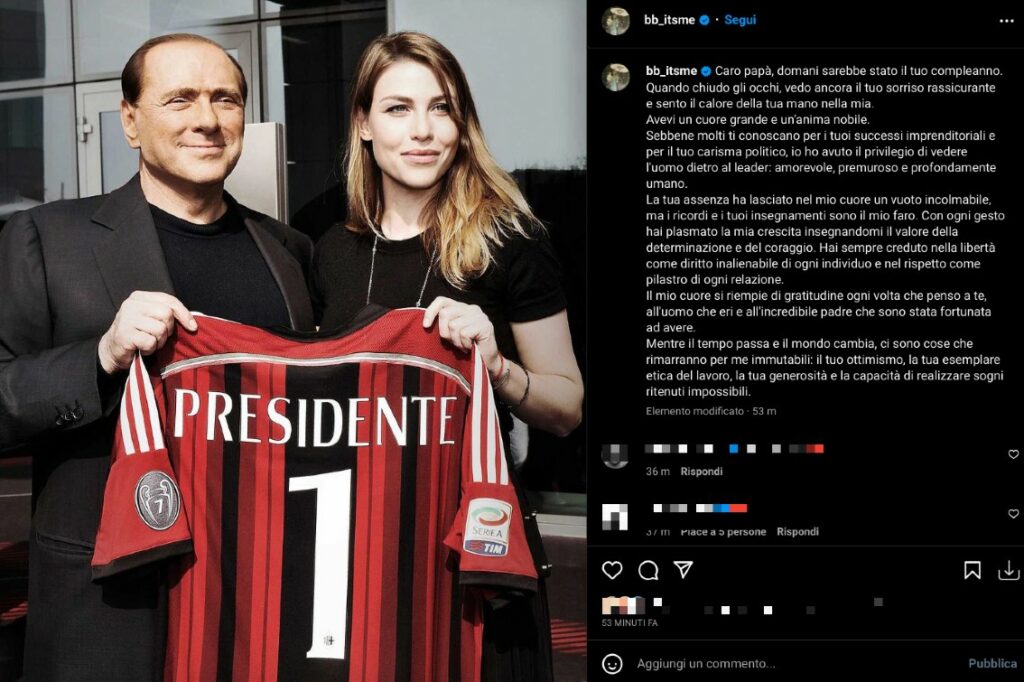 La prima figlia di Veronica Lario, seconda moglie di Silvio, accompagna le sue accorate parole con una foto che la immortala insieme al Cavaliere: entrambi tengono una maglia del Milan, la numero 1 con su scritto: “Presidente”.