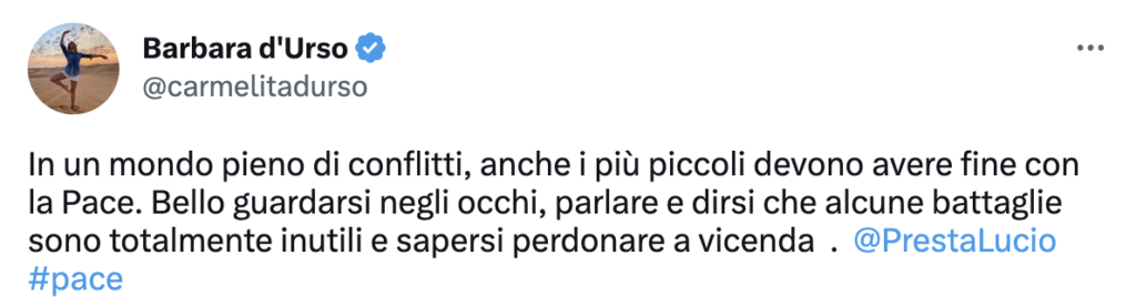 Le vecchie ruggini sono alle spalle. Barbara e Lucio si fanno vedere insieme mentre prendono un “caffeuccio”. La presentatrice scrive: “In un mondo pieno di conflitti, anche i più piccoli devono avere fine con la Pace. Bello guardarsi negli occhi, parlare e dirsi che alcune battaglie sono totalmente inutili e sapersi perdonare a vicenda”. La d’Urso sorride e anche Presta fa lo stesso. Il risentimento dell’agente verso i talk di Carmelita è evaporato.