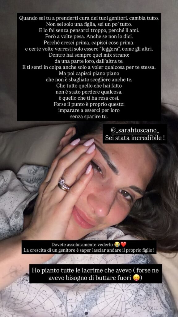 Beatrice ha scritto: ''Ho pianto tutto le lacrime che avevo. Quando sei tu a prenderti cura dei tuoi genitori cambia tutto. Non sei solo una figlia, sei un pò tutto. E lo fai senza pensarci troppo, perché li ami. Però a volte pesa. Anche se non lo dici. Perché cresci prima, capisci cose prima e certe volte vorresti solo essere "leggera", come gli altri. Dentro hai sempre quel mix strano: da una parte loro, dall'altra te. E ti senti in colpa anche solo a voler qualcosa per te stessa. Ma poi capisci piano piano che non è sbagliato scegliere anche te. Che tutto quello che hai fatto non è stato perdere qualcosa, è quello che ti ha resa così. Forse il punto è proprio questo: imparare a esserci per loro senza sparire tu''.