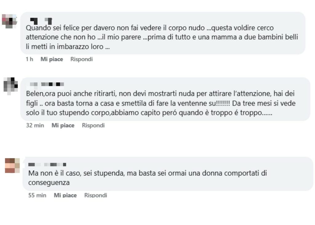 “Hai un figlio quasi adolescente perché sempre nuda? A cosa ti porta? Sembra imbarazzante per i tuoi ragazzi, appena saranno più grandi! Dovresti curare più te stessa e volerti bene senza mostrare niente”, le scrivono. E ancora: “Non si parla più di lei allora usa la tattica del nudismo”; “Ma io riconosco la bellezza di una donna e lei è bellissima senza dubbio, ma io mi vergognerei nel pubblicare certe foto. Perché? Che bisogno c'è?”. “Bellissima non c'è nulla da dire, ma ostenta troppo la sua nudità: foto di maschere intime, bagni nuda in mare, la classe non vuole dire solo bellezza e ostentazione, si può essere bellissime mantenendo un decoro e una dignità soprattutto quando si hanno due figli!” , precisa un’altra donna.