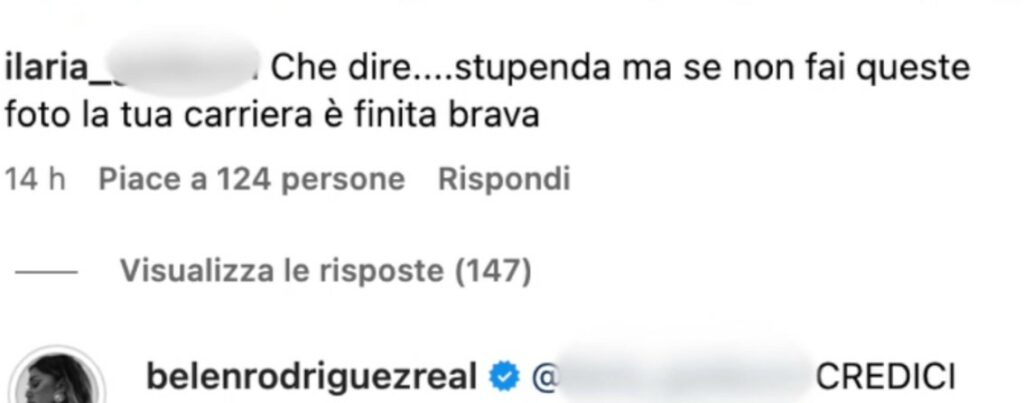 "Che dire stupenda, ma se non fai queste foto la tua carriera è finita", scrive un utente. La showgirl ribatte commentando a lettere maiuscole: "CREDICI". Nonostante sia in pausa dalla tv, ha annunciato che tornerà presto. Ha, inoltre, attività imprenditoriali con i brand di famiglia, Hinnominate e Me Fui. Quindi si ritiene fortemente sulla cresta dell’onda e non, come vorrebbero far intendere in molti, in declino.