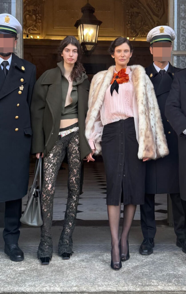 La figlia Matilde osa con un look più grintoso, indossando pantaloni di pizzo nero abbinati a un top corto e un ampio cappotto verde militare. Entrambe le mise, pur diverse, riflettono una sofisticata sensibilità per la moda.