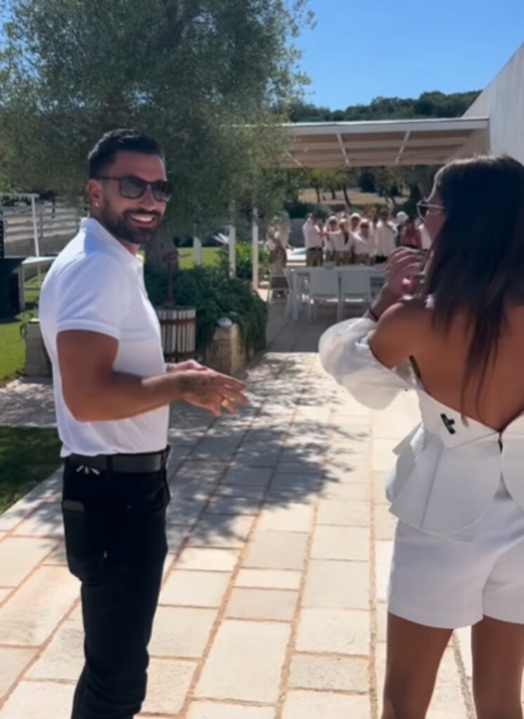 La Guaccero ha scelto la sua Puglia: i trulli fanno da cornice alla incredibile festa. Nel filmato postato su Instagram si vedono i due arrivare mano nella mano. Ad accogliere Pernice c’è un folto numero di ospiti che indossa una parrucca bionda e una maglietta bianca. Tutti gli fanno gli auguri. lui è a bocca aperta.