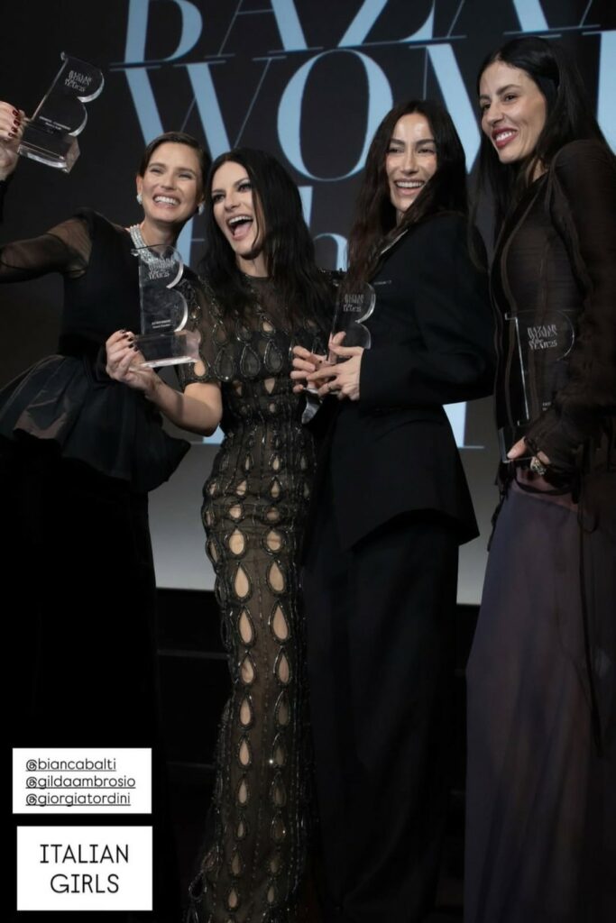 Al Bazaar Women of the Year 2025 sfilano e ricevono il premio anche altre italiane: Laura Pausini e il duo creativo The Attico, composto da Gilda Ambrosio e Giorgia Tordini. La prima indossa un abito del marchio Phan Huy: su base nera, il vestito presenta un tessuto trasparente ornato da bordature a forma di lacrima realizzate con perline e cristalli,. E’ applauditissima.