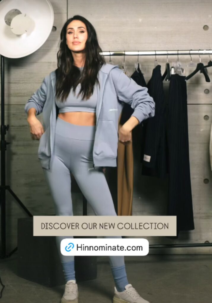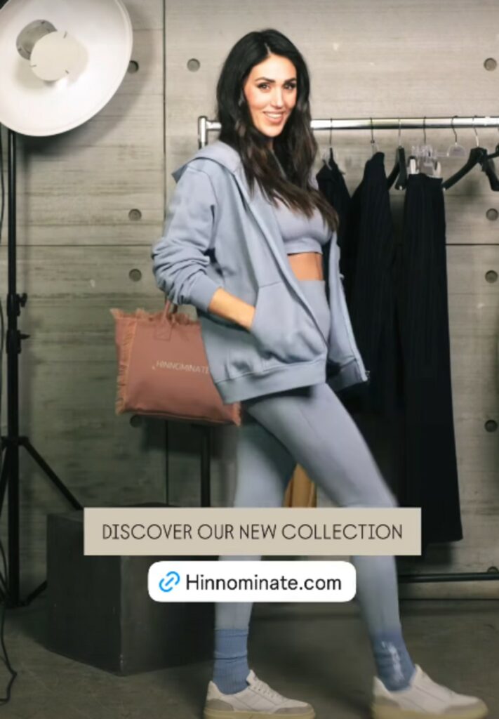 Chechu mostra la nuova collezione del brand di famiglia, Hinnominate. E’ questione di pochi istanti, ma quando indossa il top coordinato con i leggings e la felpa, tutto color celeste avion, ecco che le sue forme tornano ad apparire come quelle di una mamma a inizio gestazione.