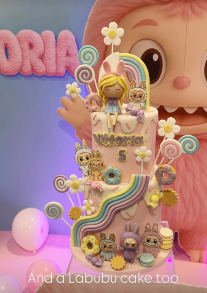 “Buon compleanno Vittoria - scrive la mamma - Lei ha voluto il tema Labubu”, fa sapere la Ferragni. Al party anche la pignatta è a forma di Labubu, come pure ovviamente la magnifica torta a due piani decorata in pasta di zucchero, tutta nei toni del rosa pastello. Sopra c’è raffigurata pure la festeggiata.