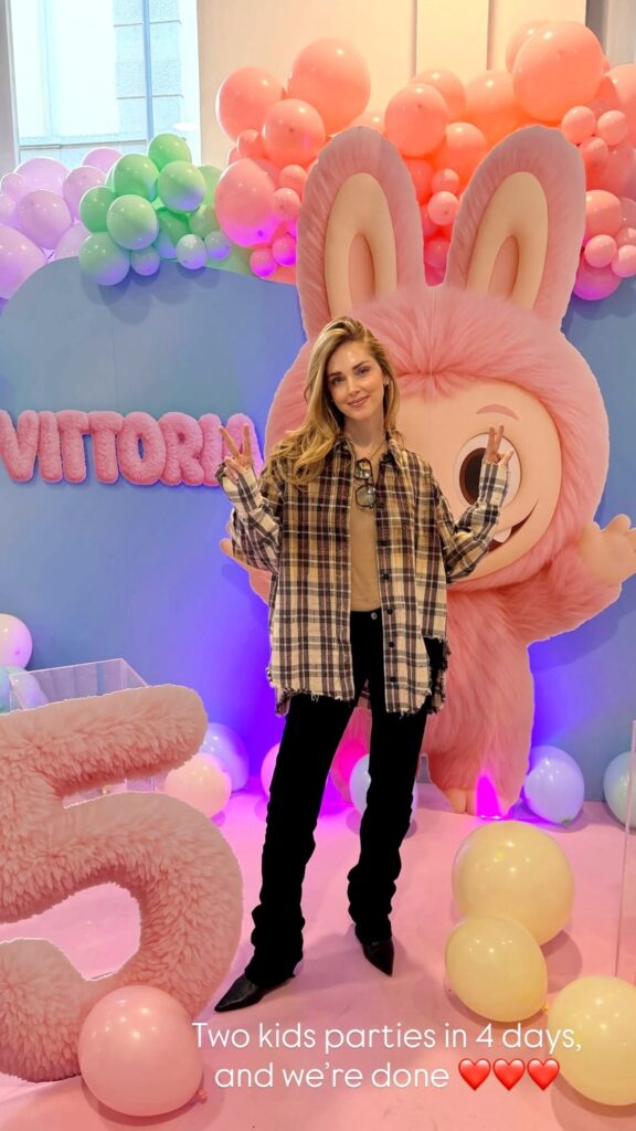 “Due party per bambini in 4 giorni e noi l’abbiamo fatto”, fa notare orgogliosa nelle sue Storie. Chiara Ferragni festeggia i 5 anni della figlia Vittoria a Milano. Le foto condivise nelle Storie svelano il tema scelto: la secondogenita della fashion blogger e di Fedez ha fortemente desiderato e ottenuto un ‘Labubu party’.