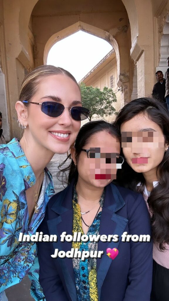 Chiara, a supporto di quel che ha appena fatto sapere, pubblica nelle sue storie uno scatto in cui è con due donne: una tiene in mano il cellulare per fare un selfie a tre. La signora in questione non ha riconosciuto affatto la fashion blogger e imprenditrice da milioni di euro, ma è rimasta colpita dai suoi ‘colori’. “Qui per esempio oggi a Jodhpur”, scrive lei.