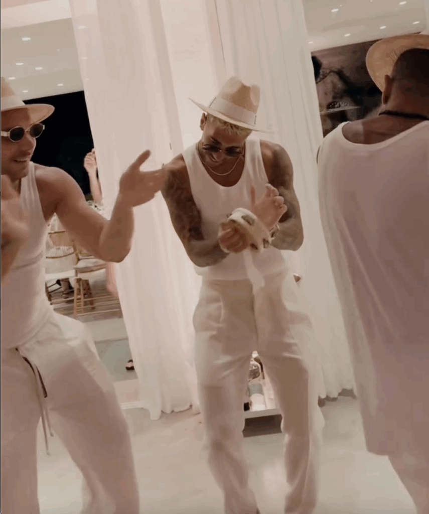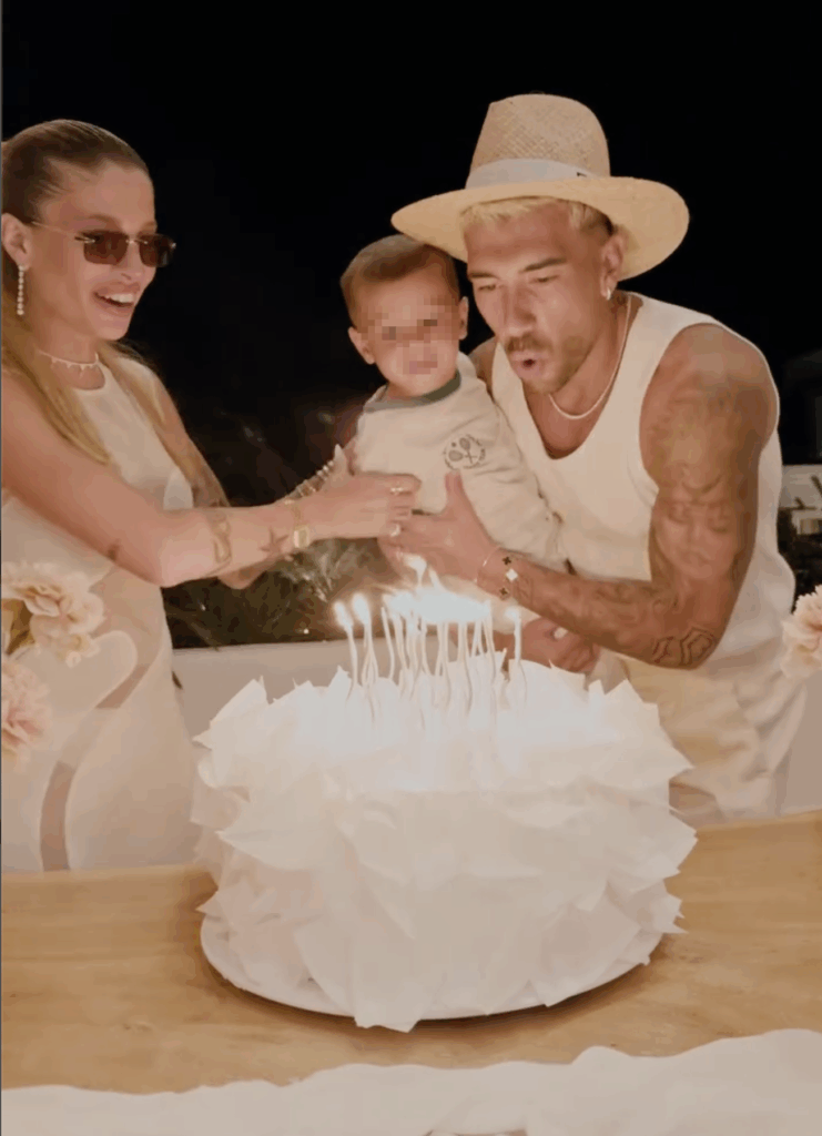 Zaccagni sfoggia un completo estivo casual: giacca, portata con sotto una canottiera in tono, e pantaloni. In testa, poi mette un cappello di paglia con su scritto “Zac30”. Il copricapo è per tutti gli invitati: anche loro ne hanno uno poggiato sul tavolo. Pure i piccolini della coppia rispettano il tema assegnato alla serata.