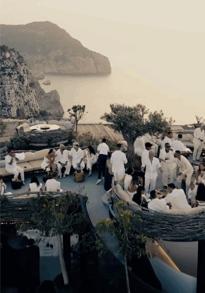 Chiara ha fortemente voluto che la festa si svolgesse all’Edén Restaurante, che si trova all’interno Hacienda Na Xamena, a Port de Sant Miguel, nella parte settentrionale di Ibiza. L'hotel è situato in cima a una scogliera, a circa 180 metri di altezza, e circondato dal verde. Per essere perfetta, opta per un abito nude look, un modello firmato Alaia aderente e lungo fino alla caviglia con innesti in tessuto trasparente. Costa 2900 euro.