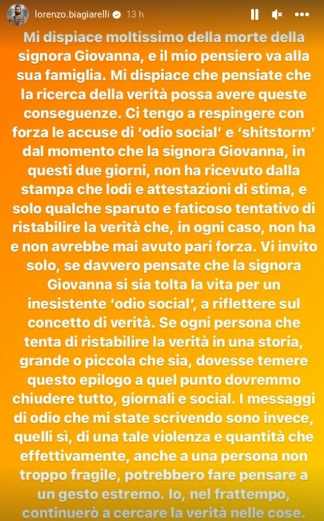 Biagiarelli aggiunge: “Vi invito solo, se davvero pensare che la signora Giovanna si sia tolta la vita per un inesistente ‘odio social', a riflettere sul concetto di verità. Se ogni persona che tenta di ristabilire la verità in una storia, grande o piccola che sia, dovesse temere questo epilogo a quel punto dovremmo chiudere tutto, giornali e social. I messaggi di odio che mi state scrivendo sono invece, quelli sì, di una tale violenza e quantità che effettivamente, anche a una persona non troppo fragile, potrebbero far pensare a un gesto estremo. Io, nel frattempo, continuerò a cercare la verità nelle cose”.