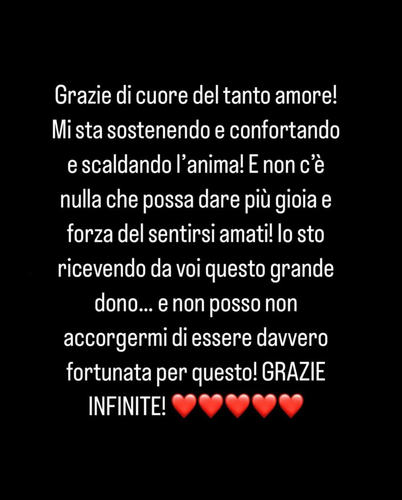 Per lei, che quando arriva a casa di Clizia e Paolo ha Gabriele che corre ad abbracciarla stretto stretto, arrivano tantissimi messaggi di grande affetto. “Grazie di cuore del tanto amore! - scrive - Mi sta sostenendo e confortando e scaldando l’anima! E non c’è nulla che possa dare più gioia e forza del sentirsi amati! Io sto ricevendo da voi questo grande dono… E non posso non accorgermi di essere davvero fortunata per questo. Grazie infinite”.