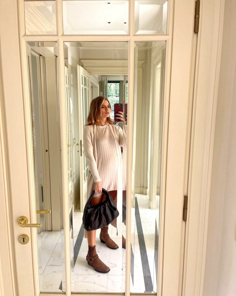 Cristina Marino si lascia ammirare dai follower con le sue forme da mamma: incinta è orgoglisa del suo pancione di 7 mesi. Sul social lo scopre davanti allo specchio, poi si fotografa con un look autunnale: indossa un corto vestito in maglia color panna.