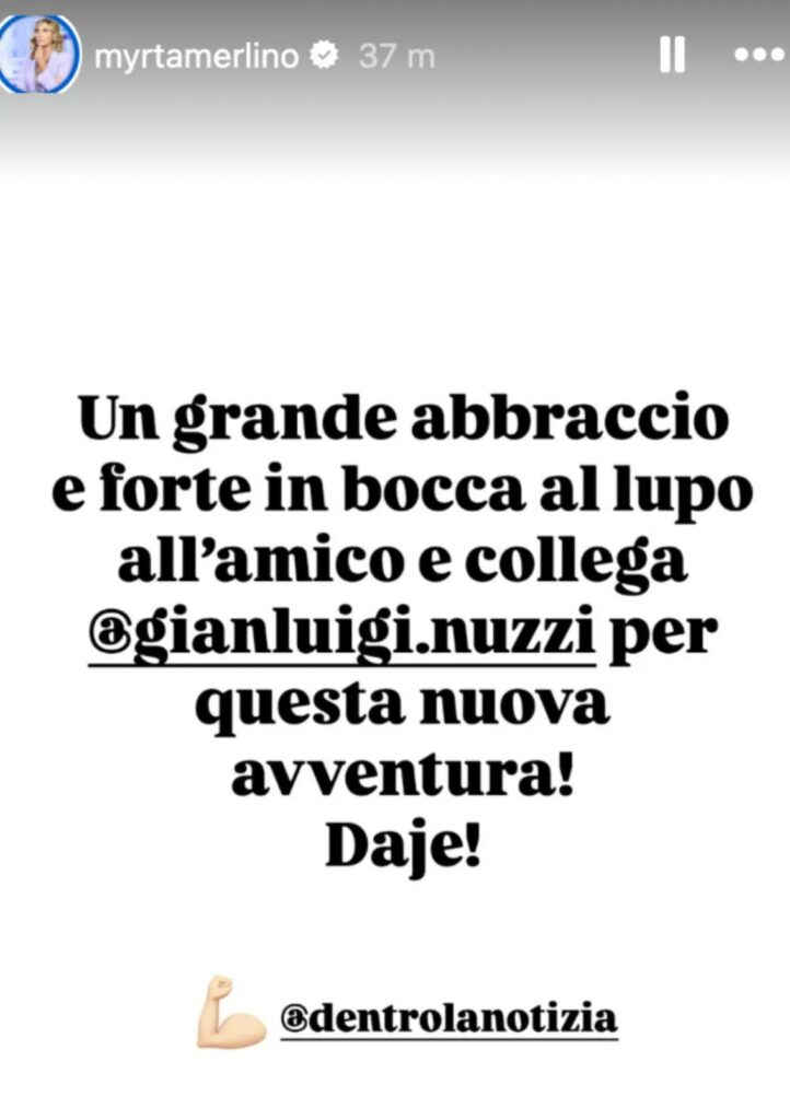 Fino al 2023 al timone c’era Barbara d’Urso. Dalla stagione 2023/2024 Pomeriggio 5 era stato affidato a Myrta Merlino, che a giugno ha salutato tutti. Ieri la 56enne nelle sue IG Stories ha dedicato un pensiero positivo al collega che ha iniziato il nuovo programma e ha scritto: “Un grande abbraccio e un forte in bocca al lupo all’amico e collega Gianluigi Nuzzi per questa nuova avventura. Daje”.