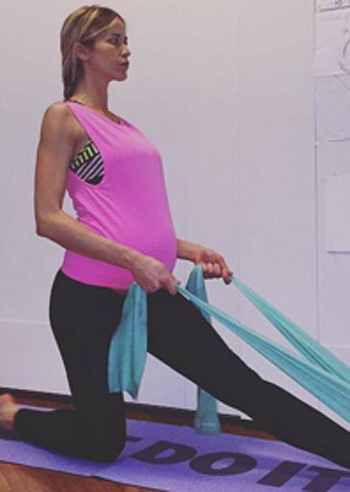 La Santarelli pratica gli esercizi con un'agilità sorprendente vista la sua condizione di futura mammina bis: si piega in avanti con disinvoltura e riesce anche toccare per terra con le mani.