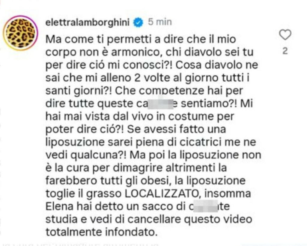 Dopo i pranzi e i cenoni di Vigilia, Natale e Santo Stefano si era pesata scoprendo di aver preso solo 300 grammi in più. Sollevata, aveva pubblicato il breve video sui social ed era stata criticata da qualcuno. Lei aveva replicato: “Madonna che generazione di insicuri che siete... ma fatevi ‘na risata, va. Non si puó più dire né fare un ca**o, finti perbenisti! Poi siete i primi a dare il cattivo esempio”. Elettra Lamborghini ora sbotta contro la fitness coach che, riprendendo il suo brevissimo filmato postato, ipotizza una sua liposuzione. “Dici caz*ate!”, tuona la 31enne. Poi cancella il commento, ma quel che arriva sul web, difficilmente poi scompare…