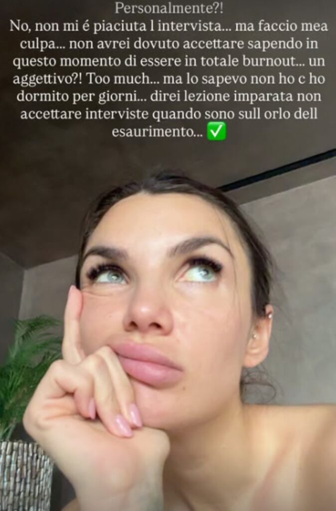 “Personalmente? No, non mi è piaciuta l’intervista…ma faccio mea culpa…”, sottolinea la cantante ed ereditiera. Spiega le sue ragioni: “Non avrei dovuto accettare sapendo in questo momento di essere in totale burnout”.