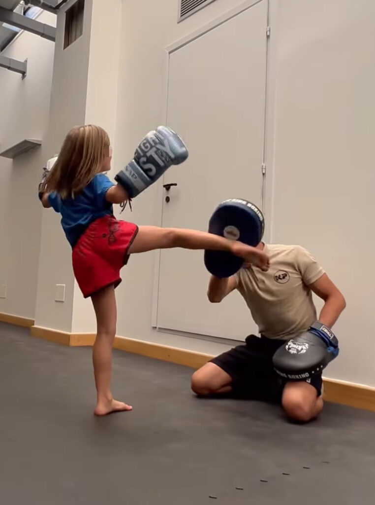 Elisabetta Canalis ha trasmesso la sua stessa passione alla figlia: la piccola è un’amante degli sport da combattimento. Più volte l’ex velina in palestra ha insegnato alla bimba la kickboxing, ora la porta con lei in sala pure in Italia e la fa allenare da un personal trainer. Skyler Eva a soli 6 anni è già brava come la madre a boxare.