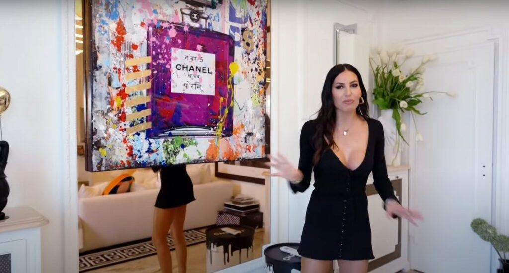Il salone, immenso, ha un divano grande bianco, in una stanza aperta a cui si accede dal living c’è il tavolo da pranzo con le sedie: tutto black. Sono tantissimi gli oggetti che ricordano il suo lavoro, c’è un quadro con sopra l’immagine del profumo Chanel N. 5 acquistato ad Amsterdam a cui la calabrese tiene moltissimo.