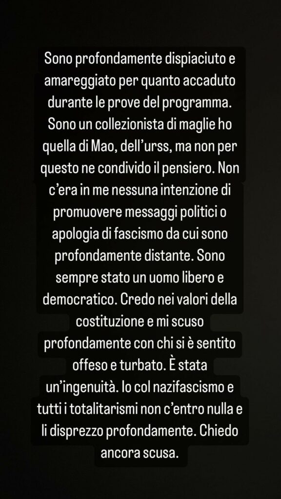 L’attore però non ci sta. Sul social spiega: “Sono profondamente dispiaciuto e amareggiato per quanto accaduto durante le prove del programma. Sono un collezionista di maglie: ho quella di Mao, dell'Urss, ma non per questo ne condivido il pensiero. Non c'era in me nessuna intenzione di promuovere messaggi politici o apologia di fascismo da cui sono profondamente distante. Sono sempre stato un uomo libero e democratico. Credo nei valori della Costituzione e mi scuso profondamente con chi si è sentito offeso e turbato. E' stata un'ingenuità. Io col nazifascismo e tutti i totalitarismi non c'entro nulla e li disprezzo profondamente. Chiedo ancora scusa”.