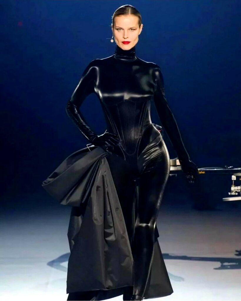 Thierry Mugler dopo 3 anni di attesa presenta la sua collezione nella capitale di Francia e chiama le top over 40 per una collezione all’insegna dell’inclusività. Il centro culturale de La Villette di Parigi si illumina per il fashion show a chiusura dell’Alta Moda. Il défilé mette sotto i riflettori, sul catwalk, un cast di modelle diversissime tra loro per età, etnia, genere e fisicità. Eva in total black, sensualissima, è la loro ‘regina’.