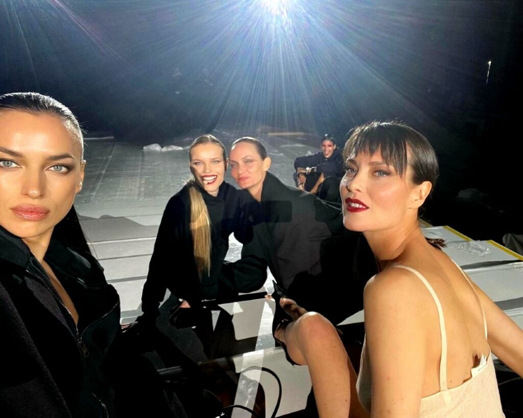 La ceca, naturalizzata italiana, legata all'imprenditore torinese Gregorio Marsiaj e madre di tre figli (George nato nel giugno 2007, Philip nato nel marzo 2011 ed Edward nato nell'aprile 2013) sfila e cattura gli obiettivi dei fotografi con la tuta aderentissima effetto ‘second skin’: è spettacolare nella sua fisicità. Con lei anche Amber Valletta (48 anni), Shalom Harlow (49), Mariacarla Boscono (42) e una delle muse del compianto stilista, Debra Shaw (49).