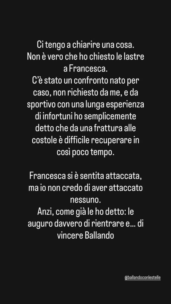 L’ex tennista 38enne sul suo profilo Instagram chiarisce: “Ci tengo a chiarire una cosa. Non è vero che ho chiesto le lastre a Francesca. C’è stato un confronto nato per caso, non richiesto da me, e da sportivo con una lunga esperienza di infortuni ho semplicemente detto che da una frattura alle costole è difficile di recuperare in così poco tempo. Francesca si è sentita attaccata, ma io non credo di aver attaccato nessuno. Anzi, come le ho già detto: le auguro davvero di rientrare e... di vincere Ballando”.